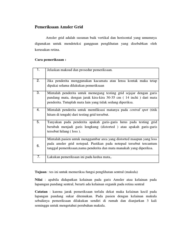 . Test your eyes under normal room lighting used for reading. Pemeriksaan amsler grid pdf. Pemeriksaan Amsler Grid merupakan faktor risiko terjadinya memberikan hasil positif yang konsisten glaukoma19 terhadap peningkatan nilai MD namun tidak demikian dengan HVFA.